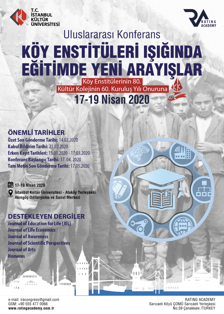 Köy Enstitülerinin kuruluÅŸunun 80. ve Kültür Kolejlerinin kuruluÅŸunun 60. yılı onuruna İstanbul Kültür Üniversitesi EÄŸitim Fakültesi ve Rating Academy iÅŸbirliÄŸi ile düzenlediÄŸimiz Köy Enstitüleri Işığında EÄŸitimde Yeni ArayiÅŸlar-2 Konferansının amacı, eÄŸitimde yaÅŸanan sorunlara çözüm bulmak ve daha iyi bir eÄŸitim modeli geliÅŸtirmek amacıyla; Köy Enstitüleri felsefesini temel alarak eÄŸitime yönelik yeni çözüm önerileri geliÅŸtirmek, yeni yöntem ve uygulamaların tartışılmasını saÄŸlamaktır. Bu amaç doÄŸrultusunda akademisyen, sanatçı, düÅŸünür, araÅŸtırmacı, öÄŸretmen ve öÄŸrencilerin bir araya geleceÄŸi bir platform oluÅŸturulması hedeflenmektedir. Konferans temelde bir eÄŸitim konferansı olmakla birlikte, konu ile iliÅŸkilendirilebilen bütün alanlara açık olup, çok disiplinli ve disiplinlerarası çalışmalara yer verilecektir. Ayrıca, konferans kapsamında sergiler ve sanatsal faaliyetler gerçekleÅŸtirilecektir.